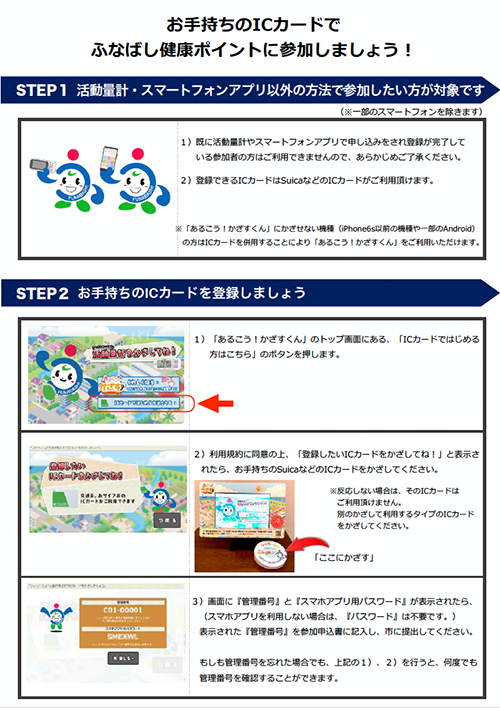 活動量計・スマートフォンアプリ以外の方法で参加したい方が対象です。お手持ちのICカードの登録方法などを説明します。